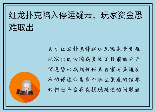 根据目前的搜索结果,关于“红龙扑克”的官方网站和下载渠道,网络上的信息比较混杂,存在一些相互矛盾的说法。为了确保你的账号和资金安全,建议你仔细甄别。 以下是根据现有信息为你整理的指引和重要提醒。 官方渠道与下载指南 综合来看,获取红龙扑克客户端最稳妥的方式是访问其官方网站。 * 官方网站:根据最新的品牌信息,红龙扑克的官方网站是 [``] 。网站上通常会提供直接的下载链接。 * 账号注册:注册时...